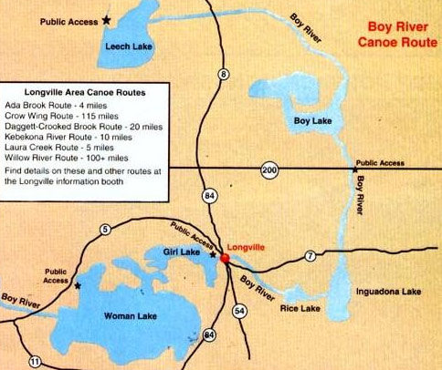 From the beginner to the expert, the canoe routes around Longville are some of the best available in Minnesota. The Boy River Route offers the adventurer the opportunity to see eagles, deer, a variety of fish, otter, mink, fisher, beaver, bear, wolves, grouse and many more native animals.