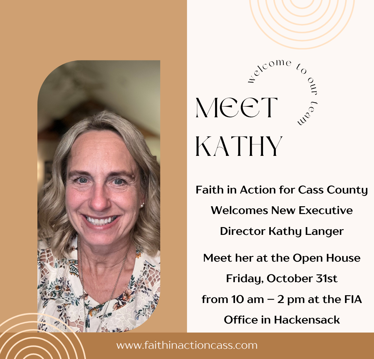 Faith in Action for Cass County is pleased to announce the appointment of Kathy Langer as its new Executive Director. To celebrate this exciting transition, the organization invites the community to an Open House on Friday, October 31, 2025, from 10:00 a.m. to 2:00 p.m. at the Faith in Action for Cass County Office, located in Hackensack, Minnesota. Community members, volunteers, and partners are encouraged to stop by, enjoy light refreshments, connect with Faith in Action staff and volunteers, welcome Kathy in her new role, and learn more about the organization’s mission, programs, and volunteer opportunities.