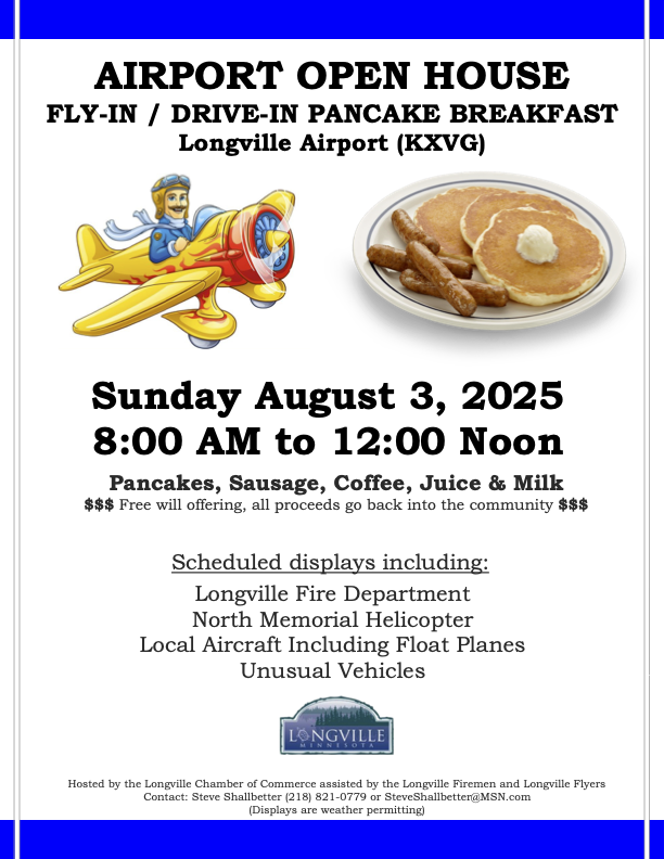 Join us for our annual Airport Open House on Sunday, August 3rd from 8:00 AM to 12:00 Noon at the Longville Airport (KXVG)!