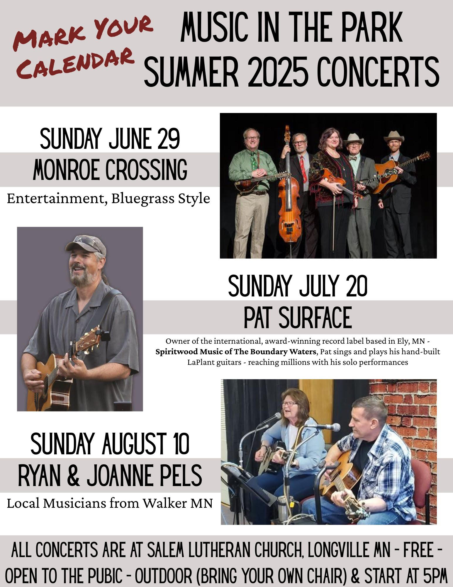 Join us for a season of free, family-friendly summer concerts right here in Longville, MN at Salem Lutheran Church! Pack a chair, bring your crew, and enjoy great music in the fresh northern air starting at 5 PM each evening. π²βοΈ