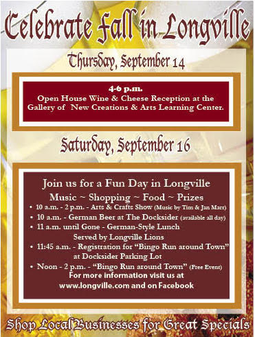 Noon-2pm: Bingo Run Around Town- Downtown Longville. FREE event. Sponsored by the Longville Chamber,